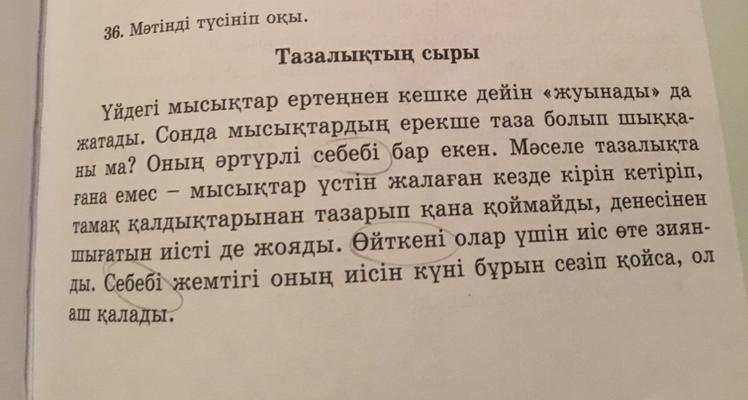 • Үй мысықтары күнде "жуынады". Сонда мысықтар тазалықты жақсы көре ме? Бұның әртүрлі себебі бар екен. Мәселе жалғыз тазалықта емес — мысықтар үстін жалаған кірін кетіріп, тамақ қалдықтарынан тазарып қана қоймайды, денесінен шығатын иісті де кетіреді. Себебі олар үшін иіс өте зиянды. Өйткені жемтігі оның иісін бұрын сезіп қойса, ол тамақсыз қалады.(келесі сөйлемді түгел көшіріп жаз)