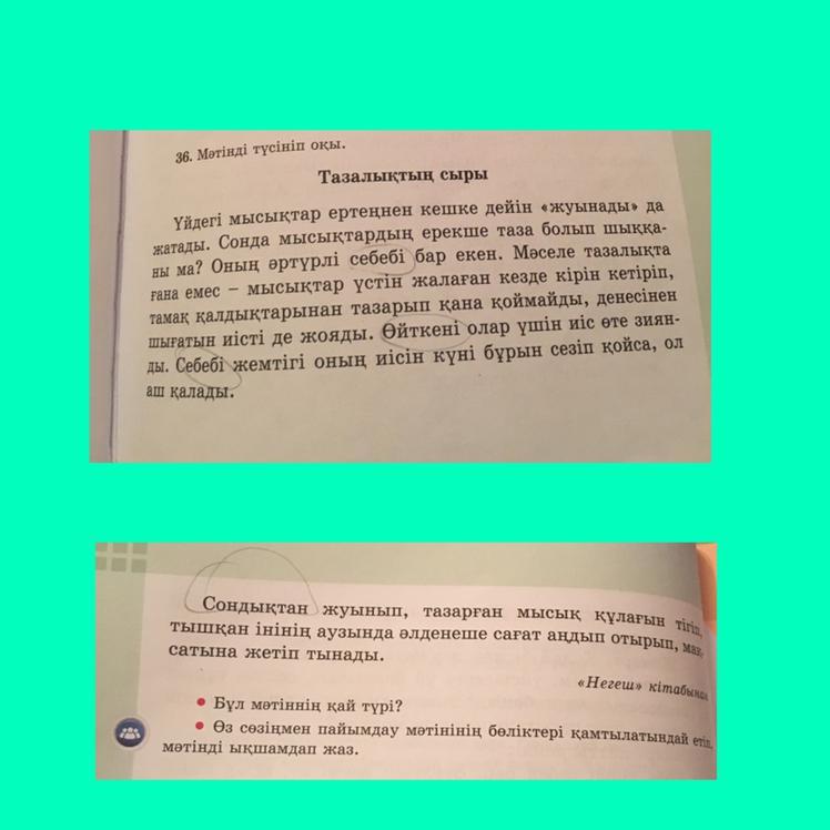 • Үй мысықтары күнде "жуынады". Сонда мысықтар тазалықты жақсы көре ме? Бұның әртүрлі себебі бар екен. Мәселе жалғыз тазалықта емес — мысықтар үстін жалаған кірін кетіріп, тамақ қалдықтарынан тазарып қана қоймайды, денесінен шығатын иісті де кетіреді. Себебі олар үшін иіс өте зиянды. Өйткені жемтігі оның иісін бұрын сезіп қойса, ол тамақсыз қалады.(келесі сөйлемді түгел көшіріп жаз)