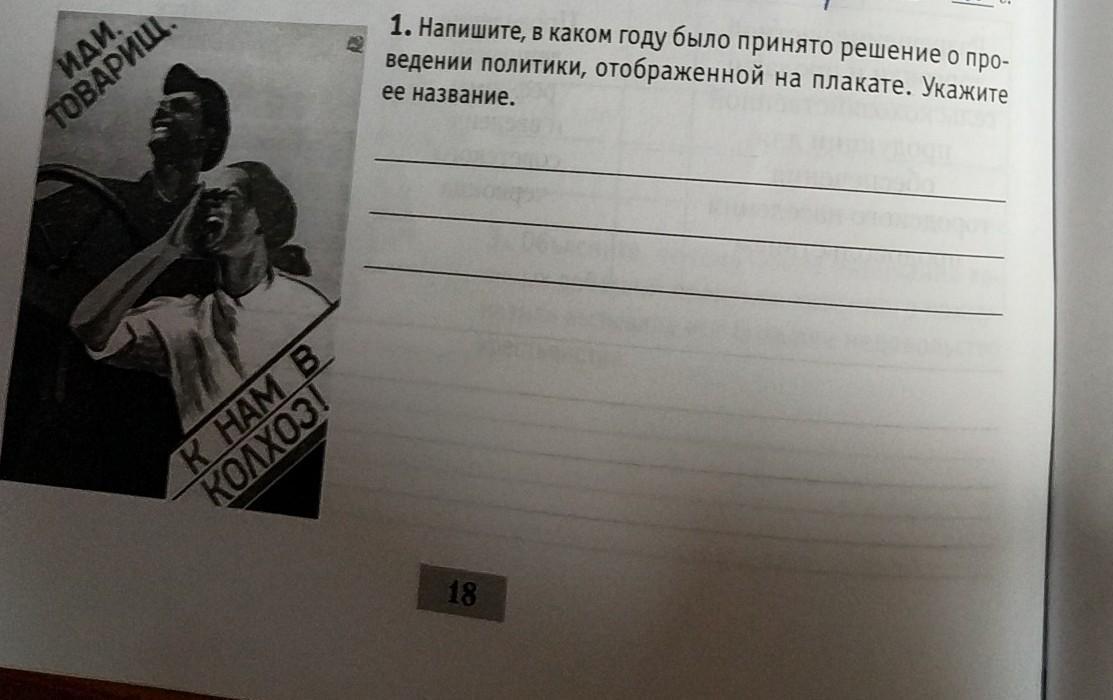 напишите в каком году были принято решение о проведении политики,отображенной на плакате.Укадите её название.