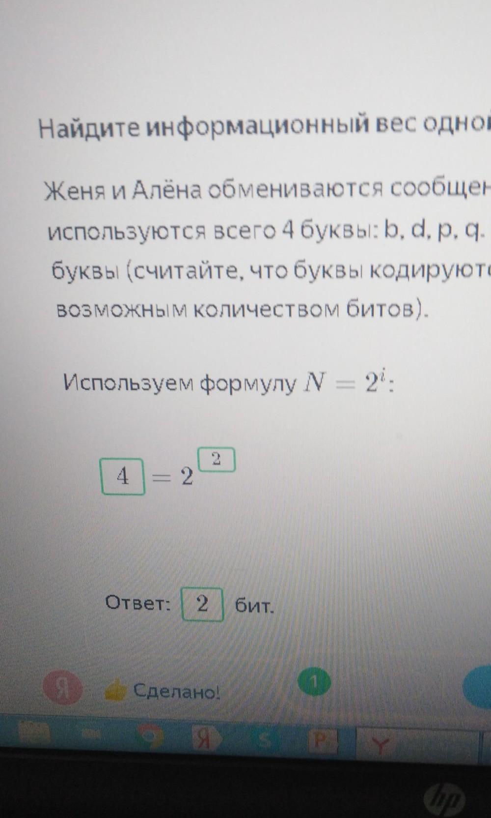 Женя Алёна обмениваться сообщениями на тайном языке. Сообщения используется всего четыре буквы:b,d,p,q. Найдите информационный вес одной буквы (Считаете что буквы кодируется одинаковым и минимально возможным количеством битов)