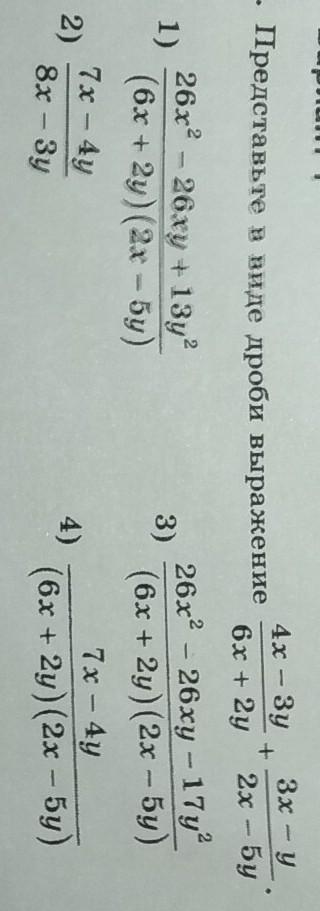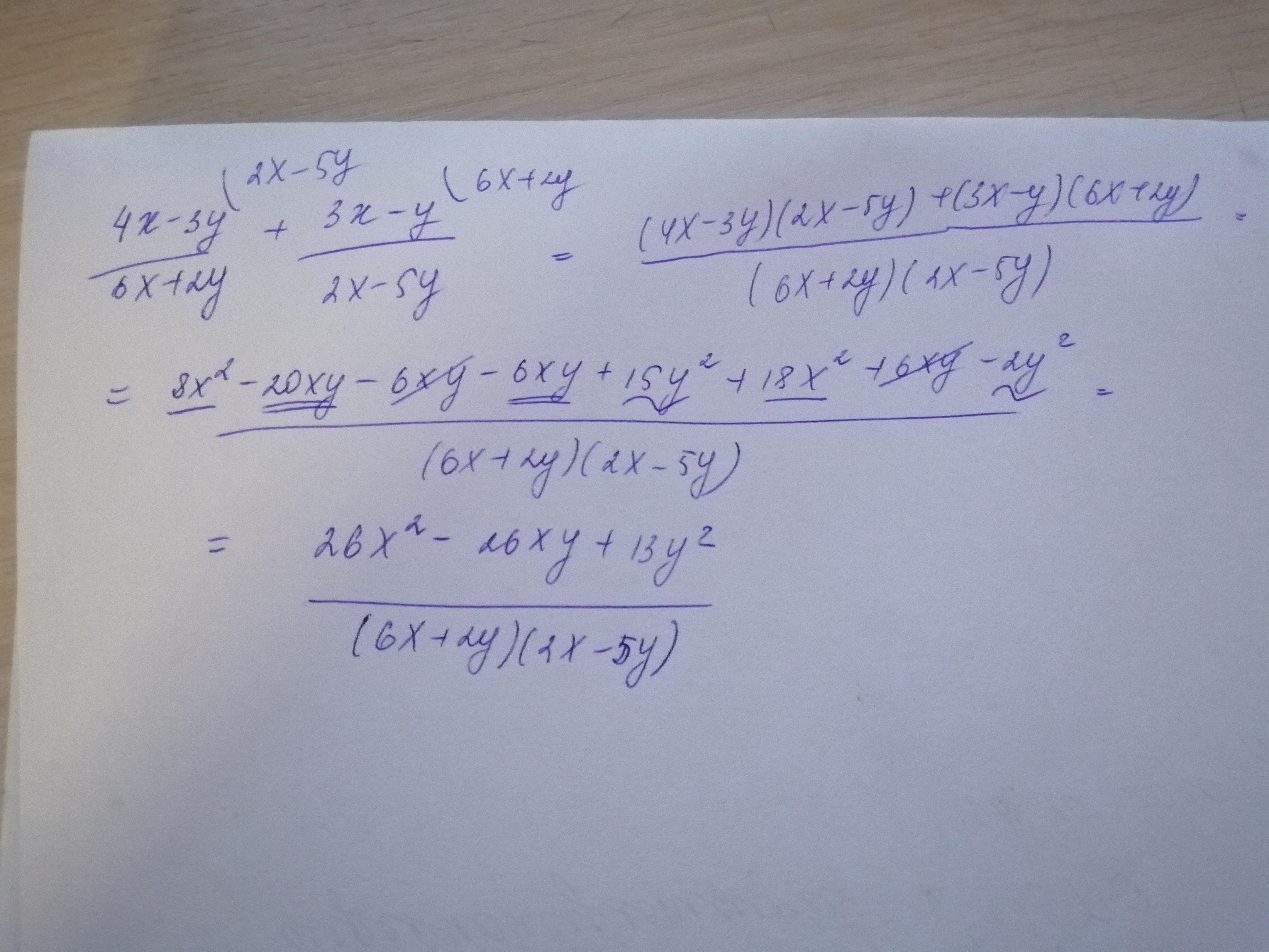 Представьте в виде дроби выражение 4x - 3y/ 6x +2y + 3x-y/2x-5y См фото ниже