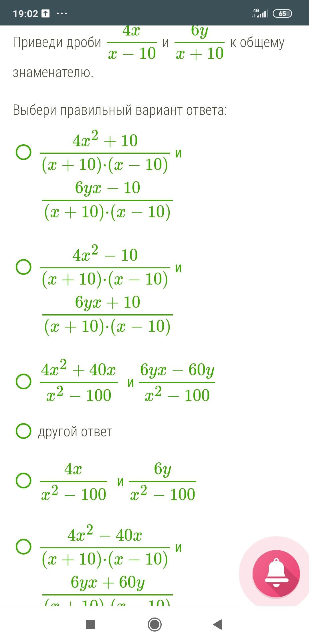 Приведи дроби 4xx−10 и 6yx+10 к общему знаменателю.