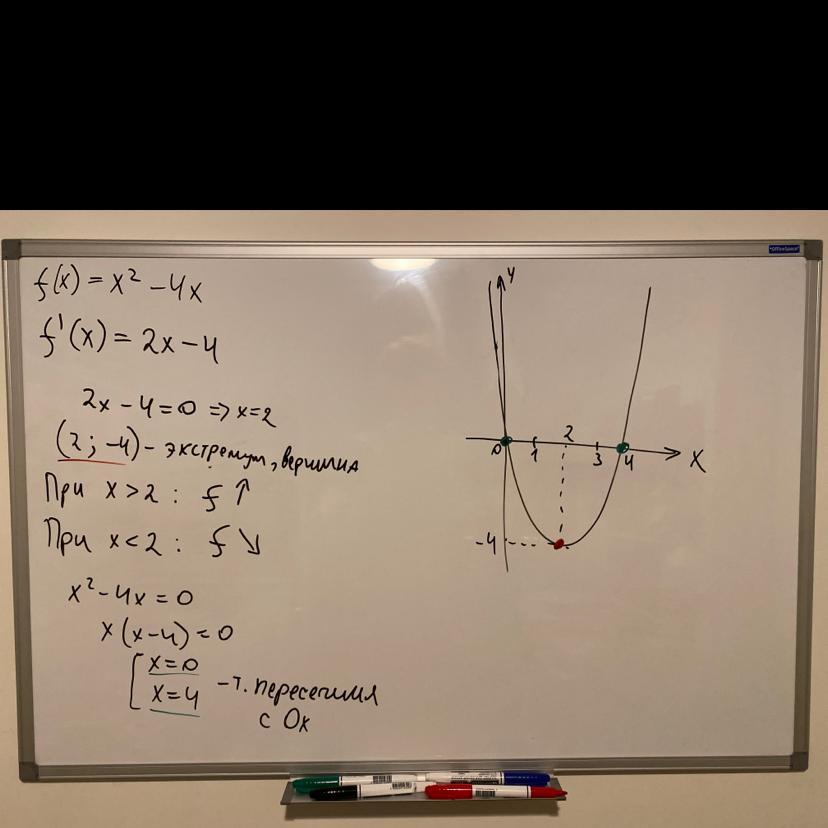 Находим производную, находим точку экстремума. Точка экстремума является и вершиной параболы (у параболы один экстремум и это вершина, на графике отмечен красным). Приравниваем функцию к нулю, получаем точки пересечения с осью Ох (отмечены зеленым). В точке 0 есть пересечение левой ветви с осью Oy.