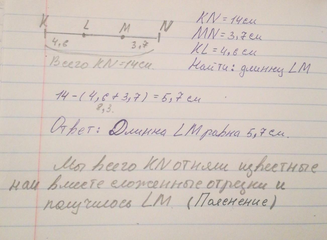На отрезке KN отмечены точки L и M. Найдите длину отрезка LM,если КN=14 см, MN=3,7 см, KL=4,6 см. Помогите пожалуйста