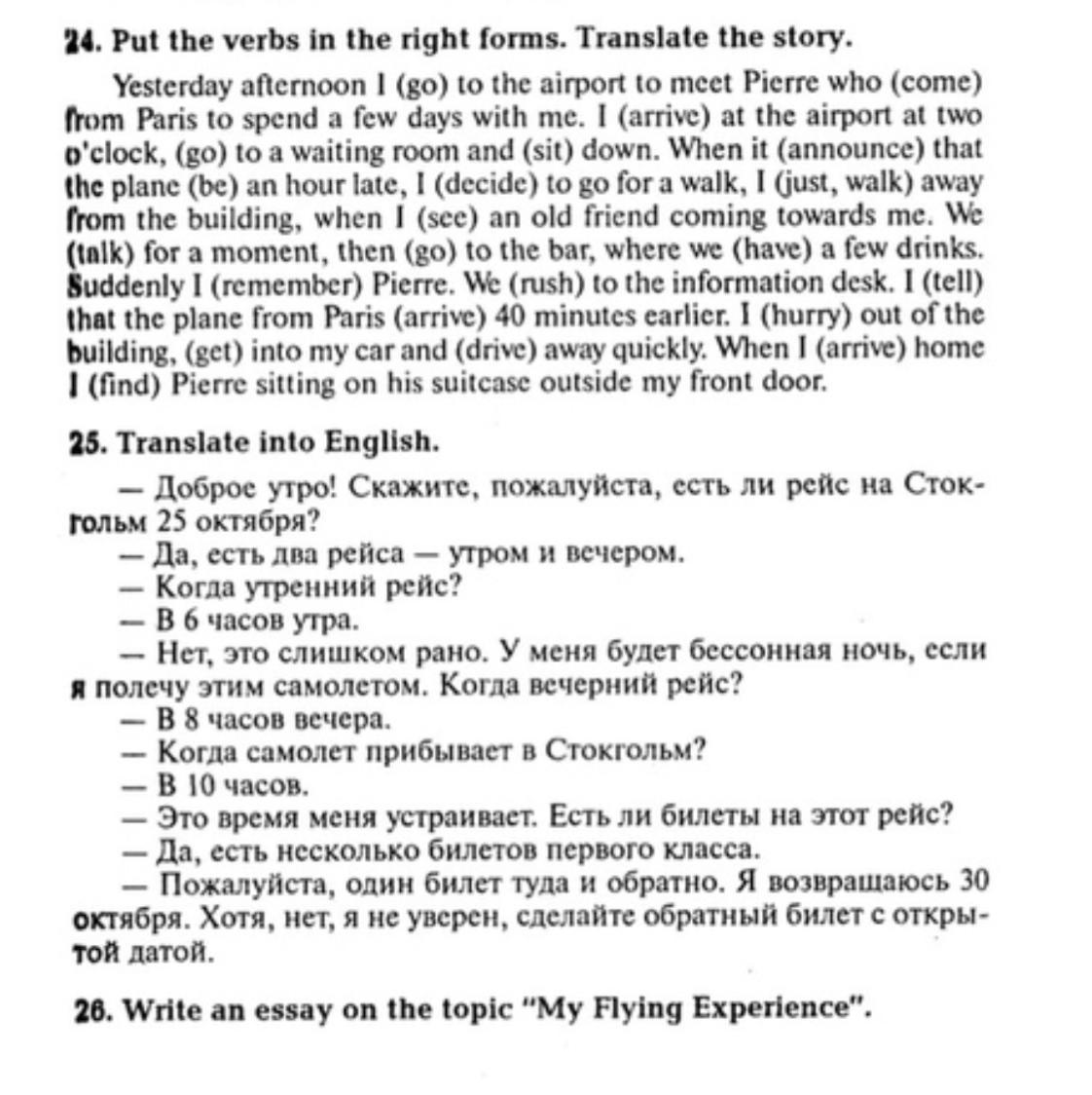Вчера днём я поехал в аэропорт, чтобы встретиться с Пьером, который приезжал из Парижа, чтобы провести со мной несколько дней. Я прибыл в аэропорт в два часа дня, пошёл в зал ожидания и сел. Когда объявили, что самолёт опоздал на час, я решил прогуляться. Я только что вышел из здания, когда увидел, что ко мне приближается старый друг. Мы немного поговорили, потом пошли в бар, где немного выпили. Вдруг я вспомнил Пьера. Мы бросились к информационному столу. Я сказал, что самолёт из Парижа прибыл на 40 минут раньше. Я поспешил из здания, сел в машину и быстро уехал. Когда я вернулся домой, я нашёл Пьера, сидящего на чемодане у моей входной двери.