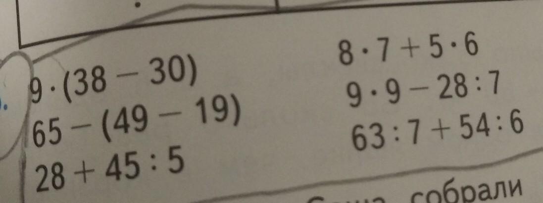 9×(38-30)=72; 8×7+5×6=86; 65-(49-19)=35; 9×9-28÷7=77; 28+45÷5=37; 63÷7+54÷6=18