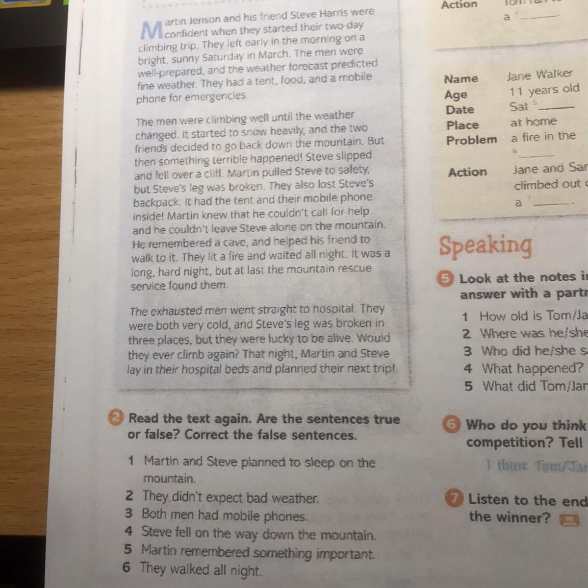 6 False. They didn't walk all night. They spent the night near the fire in the cave waiting for the rescue service.