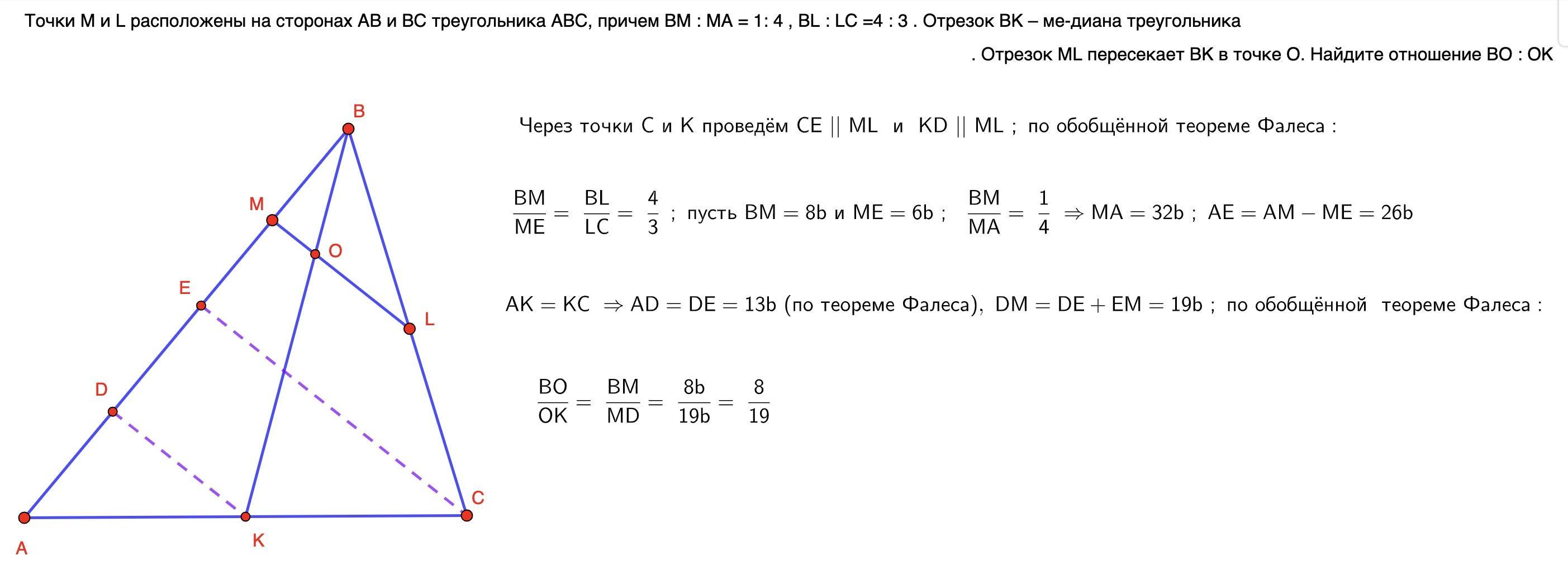 ника ABC, причем BM : MA = 1: 4 , BL : LC =4 : 3 . Отрезок BK – ме-
