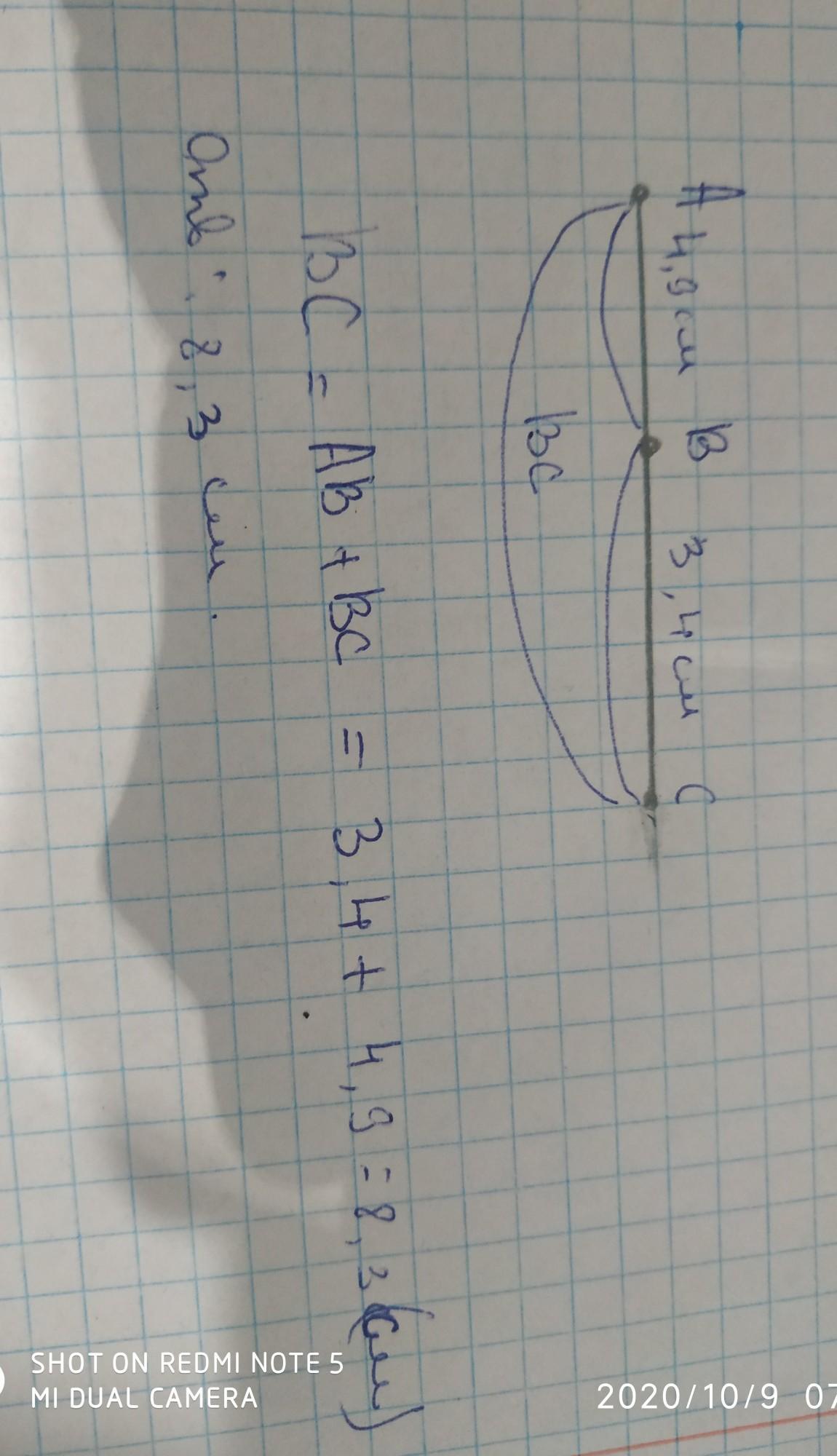 просто надо сложить AB и BC, то есть 3,4+4,9=8,3 см
