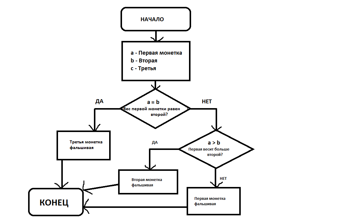 2) Представьте с помощью блок-схемы алгоритм решения следующей задачи: "Из трех монет одинакового достоинства одна фальшивая (более легкая). Как ее найти с помощью одного взвешивания на чашечных весах без гирь?".