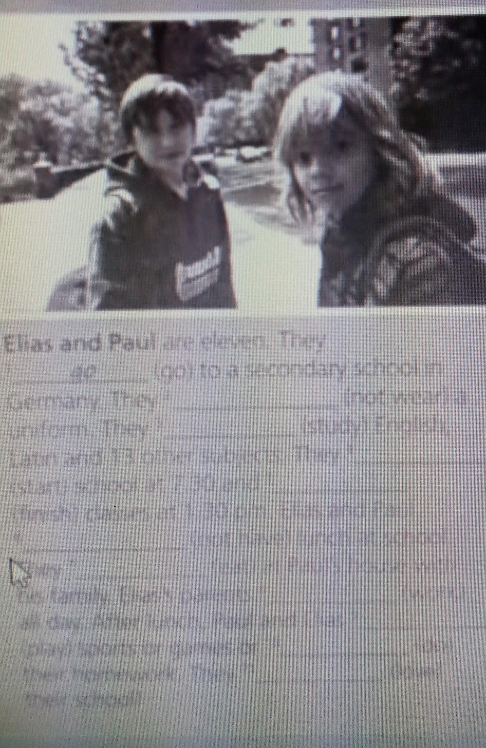Elias and Paul are eleven.They go to a secondary school in Germany.They______(not wear)a uniform.They______(study)English,Latin and 13 other subjects.They_____(start)school at 7.30 and______(finish)classes at 1.30 pm.Elias and Poul_______(not have)lunch at school.They_____(eat)at Paul's house with his family.Elias's parents_____(work)all day.After lunch,Paul and Elias______(play)sports or gamer or______(do)their homework.They____(love)their school!