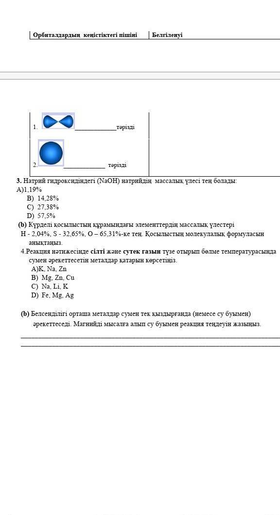 1. C 2. Гантель тәрізді р шар тәрізді s 3.a. C b. H2SO4 4 B
