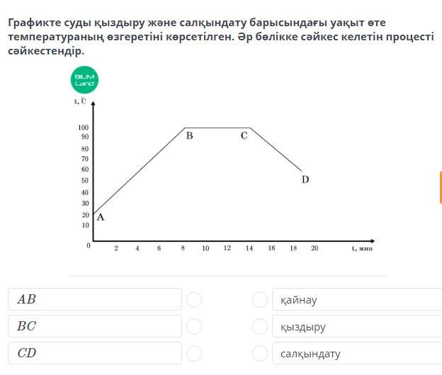 физика пожалуйста ,График показывает, что температура изменяется во времени при нагреве и охлаждении воды. Определите процесс, который применяется к каждой части.