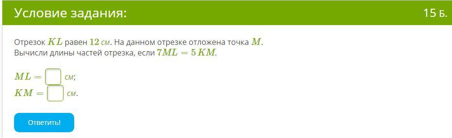 Отрезок KL равен 12 см. На данном отрезке отложена точка M. Вычисли длины частей отрезка, если 7ML=5KM.