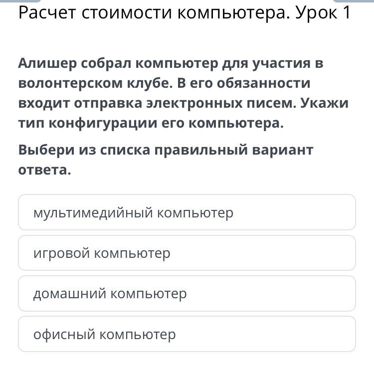 Алишер собрал компьютер для участия в волонтерском клубе. В его обязанности входит отправка электронных писем. Укажи тип конфигурации его компьютера.