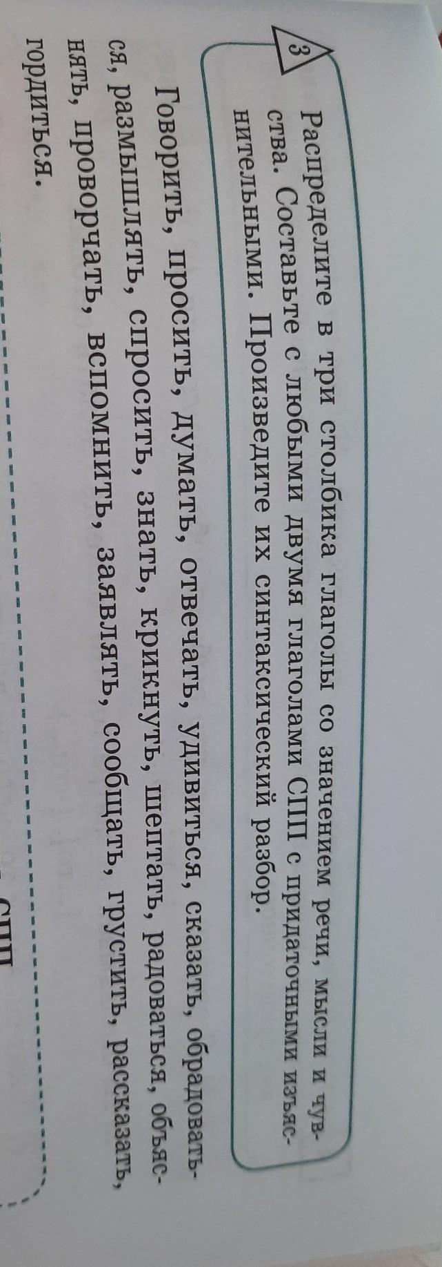 Распределите в три столбика глаголы со значением речи,мысли и чувства. Составьте с любыми двумя глаголами СПП с придаточными изъяснительными. Произведите их синтаксический разбор.