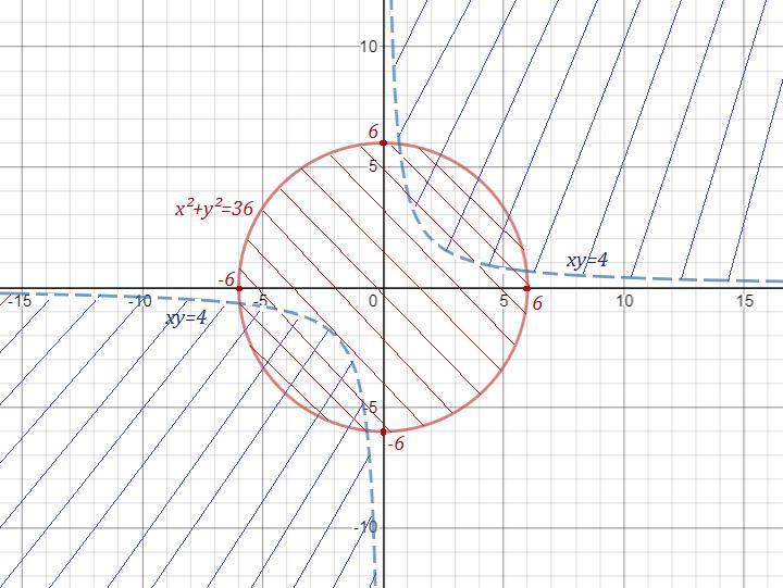 x²+y²≤ 36 - эта область- круг с центром (0,0) и R=6 , граница входит в область . Красная штриховка .