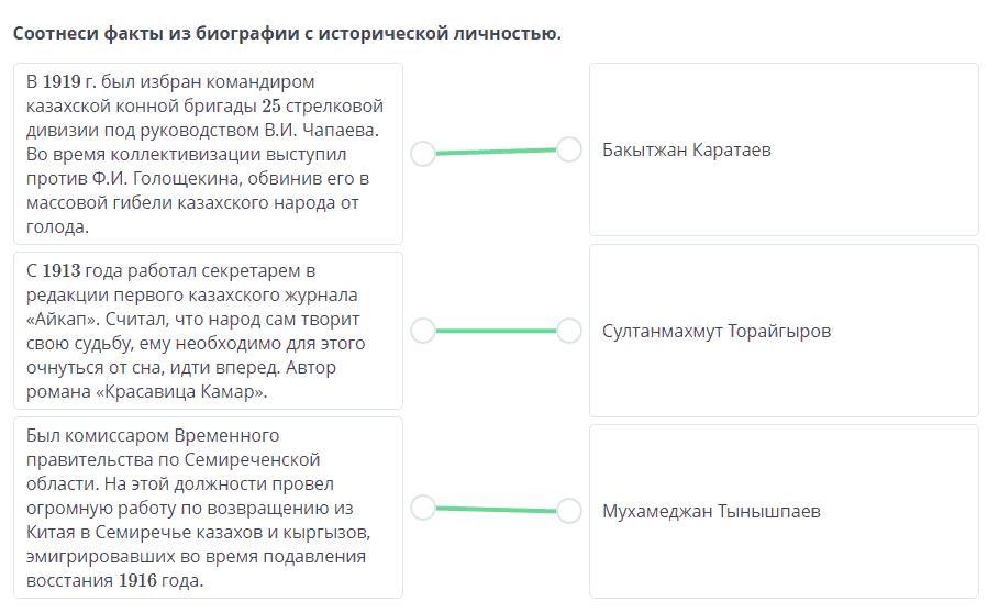 Выдающиеся представители казахской интеллигенции начала ХХ века. Урок 1 Соотнеси факты из биографии с исторической личностью. в билим ленде онлайн мектеп
