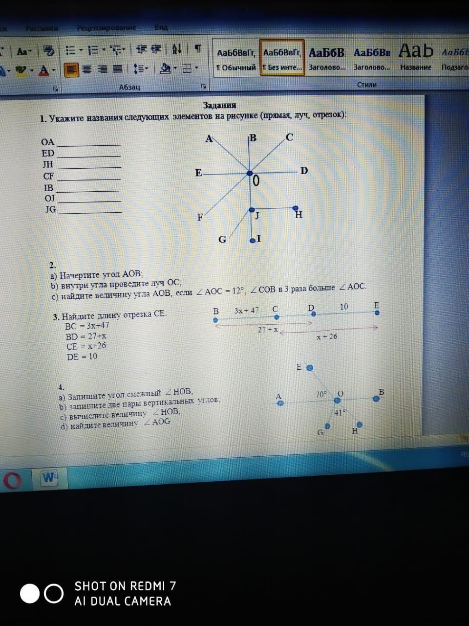 1. Укажите названия следующих элементов на рисунке (прямая, луч, отрезок):