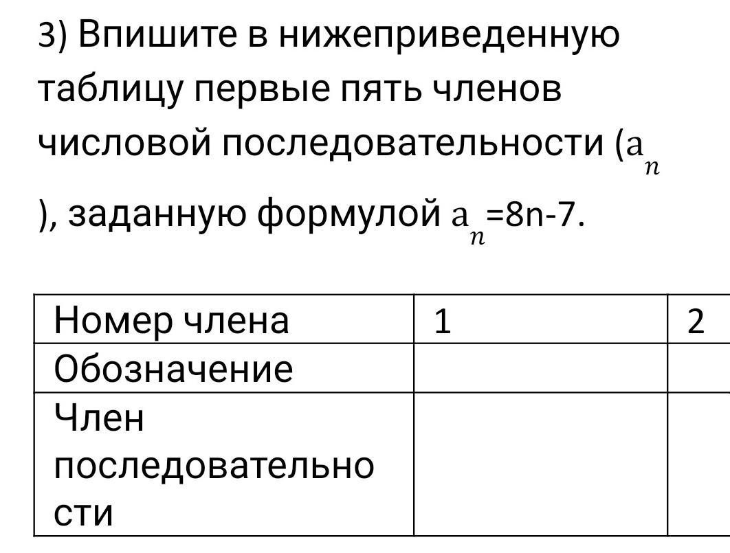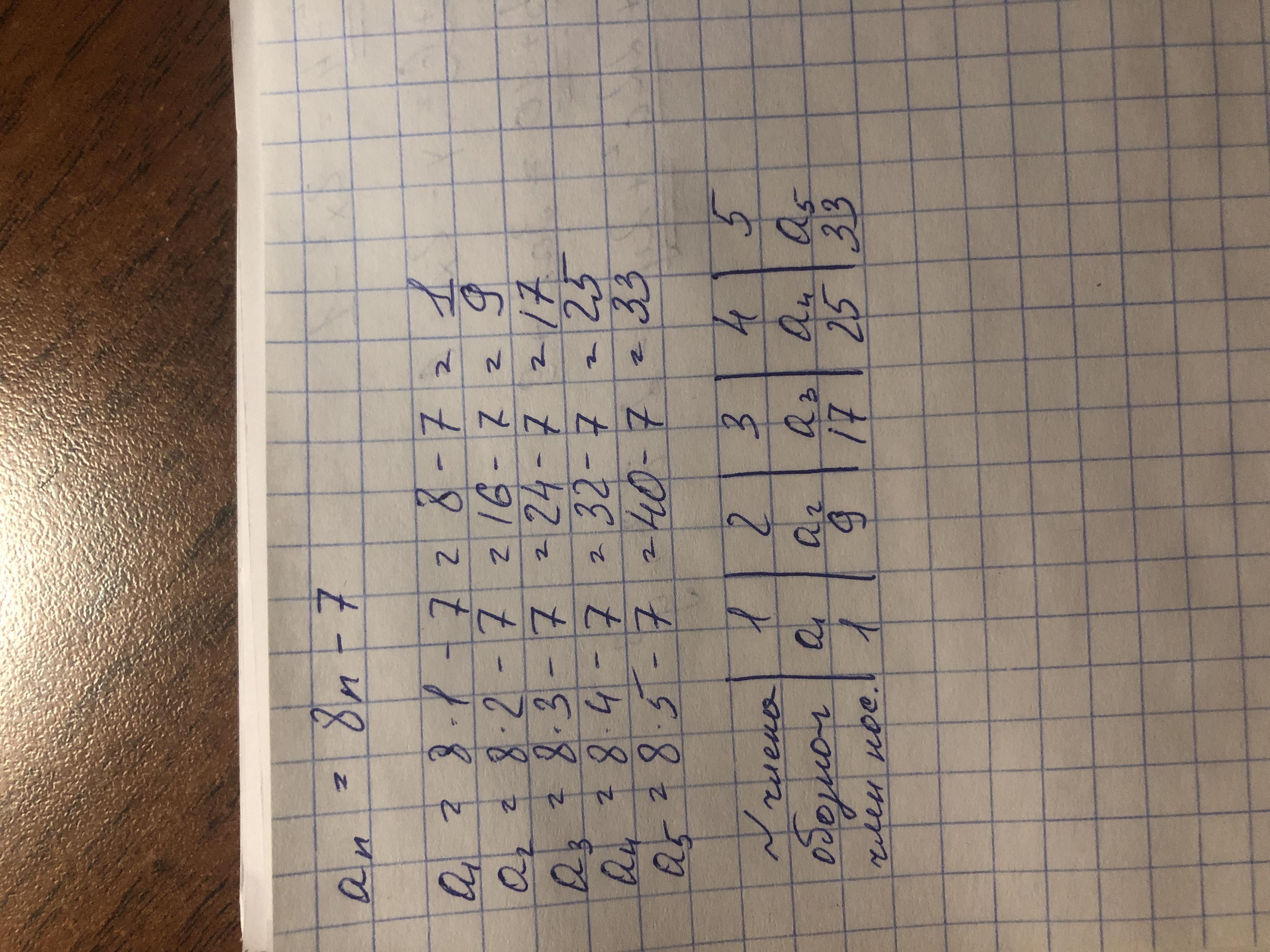 Впишите в нижеприведенную таблицу первые пять членов числовой последовательности (аn), заданную формулой аn=8n-7.