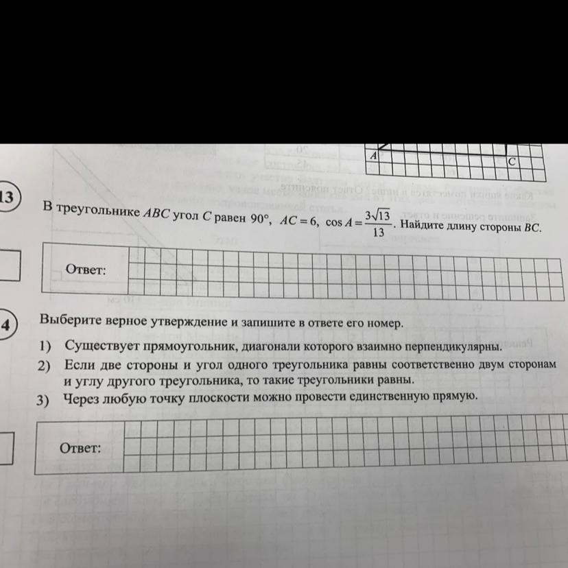 В треугольнике ABC угол C равен 90 градусов, AC=6, cos A=3корень13/13 Найдите длину стороны BC