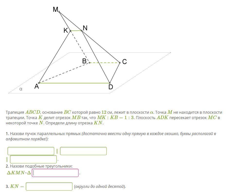 Объяснение: 1) пучок параллельных прямых: АD║KN║BC 2)Подобные треугольники: ΔKMN и ΔBMC 3)KN=12:3=4 см