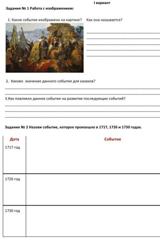 Дата: Ф.И. учащегося. Задания по суммативному оцениванию за раздел «Казахско джунгарские войны» 1 вариант Задания Ne 1 Pабота с изображением: 1. Какое событие изображено на картине? Как она называется? 2. Каково значение данного события для казахов? 3.Как повлияло данное событие на развитие последующих событий? Задания No 2 Hазови событие, которое произошло в 1717, 1726 и 1730 годах. Дата Событие 1717 год 1726 год 1730 год