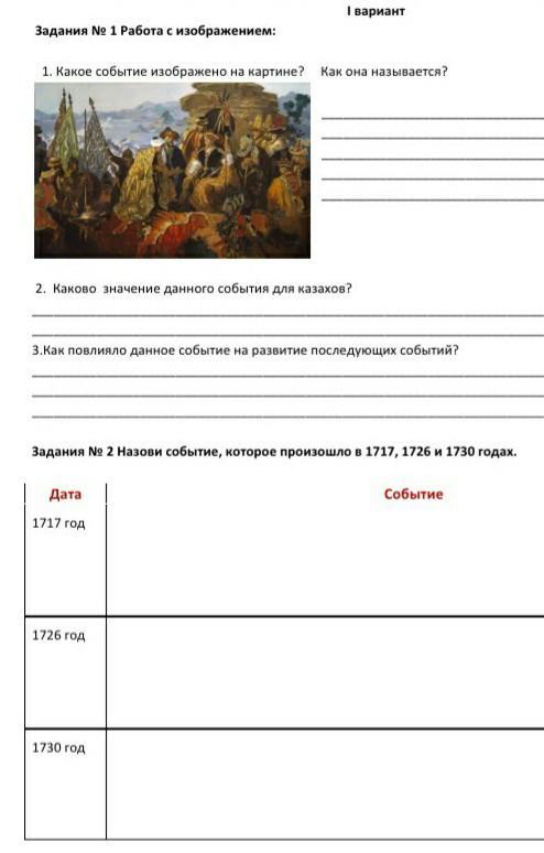 Дата: Ф.И. учащегося. Задания по суммативному оцениванию за раздел «Казахско джунгарские войны» 1 вариант Задания Ne 1 Pабота с изображением: 1. Какое событие изображено на картине? Как она называется? 2. Каково значение данного события для казахов? 3.Как повлияло данное событие на развитие последующих событий? Задания No 2 Hазови событие, которое произошло в 1717, 1726 и 1730 годах. Дата Событие 1717 год 1726 год 1730 год