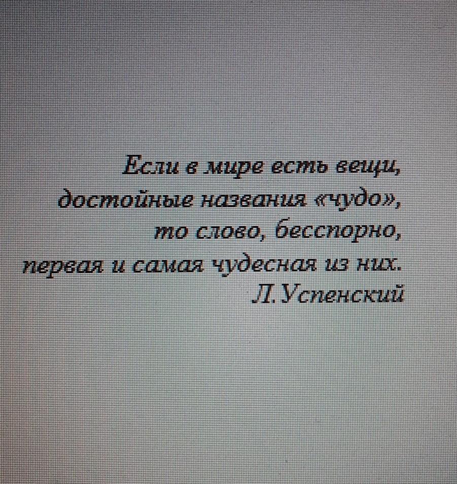 Лев Успенский говорил: если в мире есть вещи, достойные названия "чудо", то слово, бесспорно, первая и самая чудесная из них. я понимаю эти слова так, что слово это самое первое чудо, который создал человек. Ведь с помощью слов люди понимать друг друга, общаться, писать и читать. Поэтому слово - это самое первое чудо.