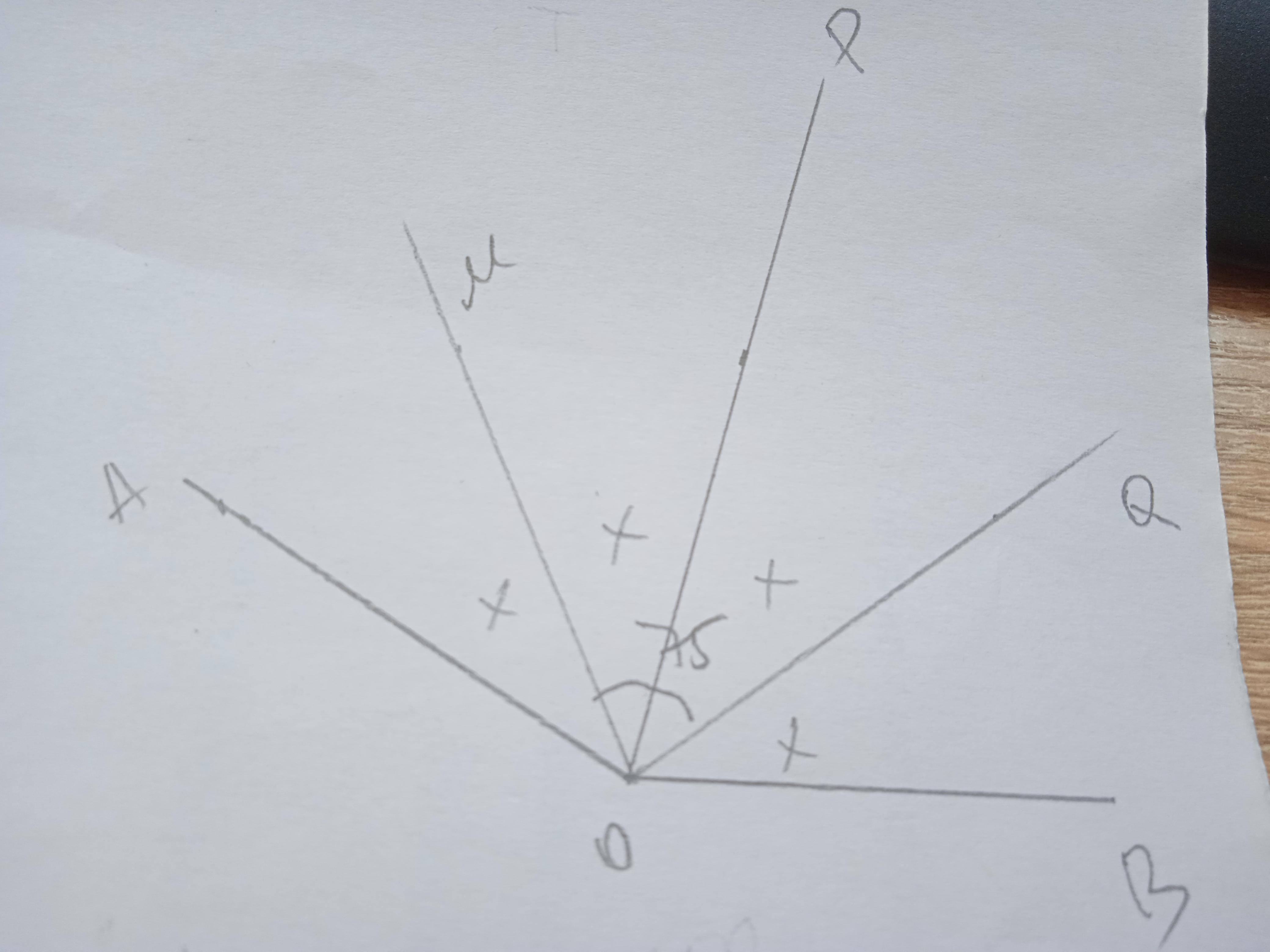 ∠АОВ разделен тремя биссектрисами ОQ, ОР и ОМ на 4 равных угла.
