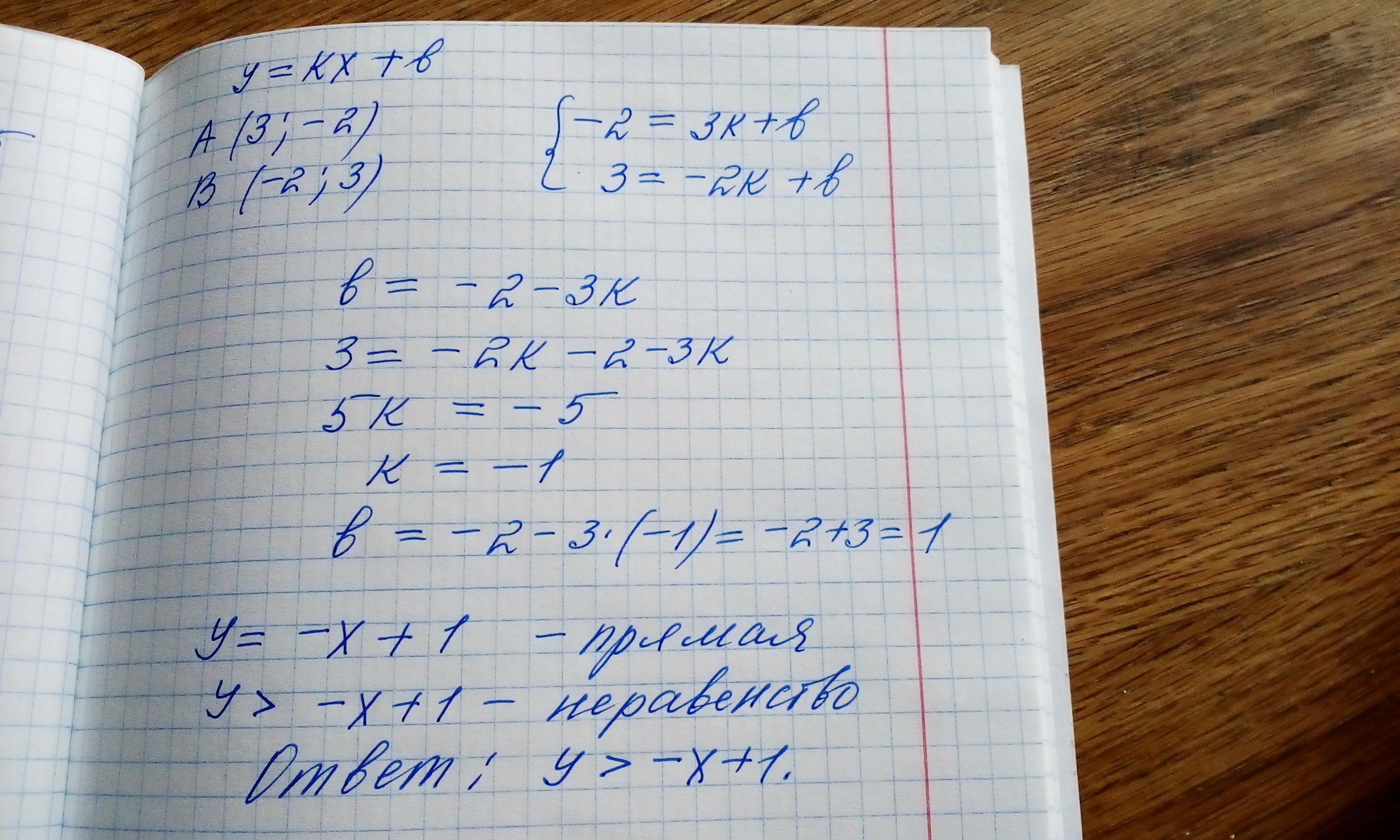 Запишите неравенство, множество решений которого изображается точками координатной плоскости, лежащими выше прямой проходящей через точки: А(3; -2) и В(-2; 3)