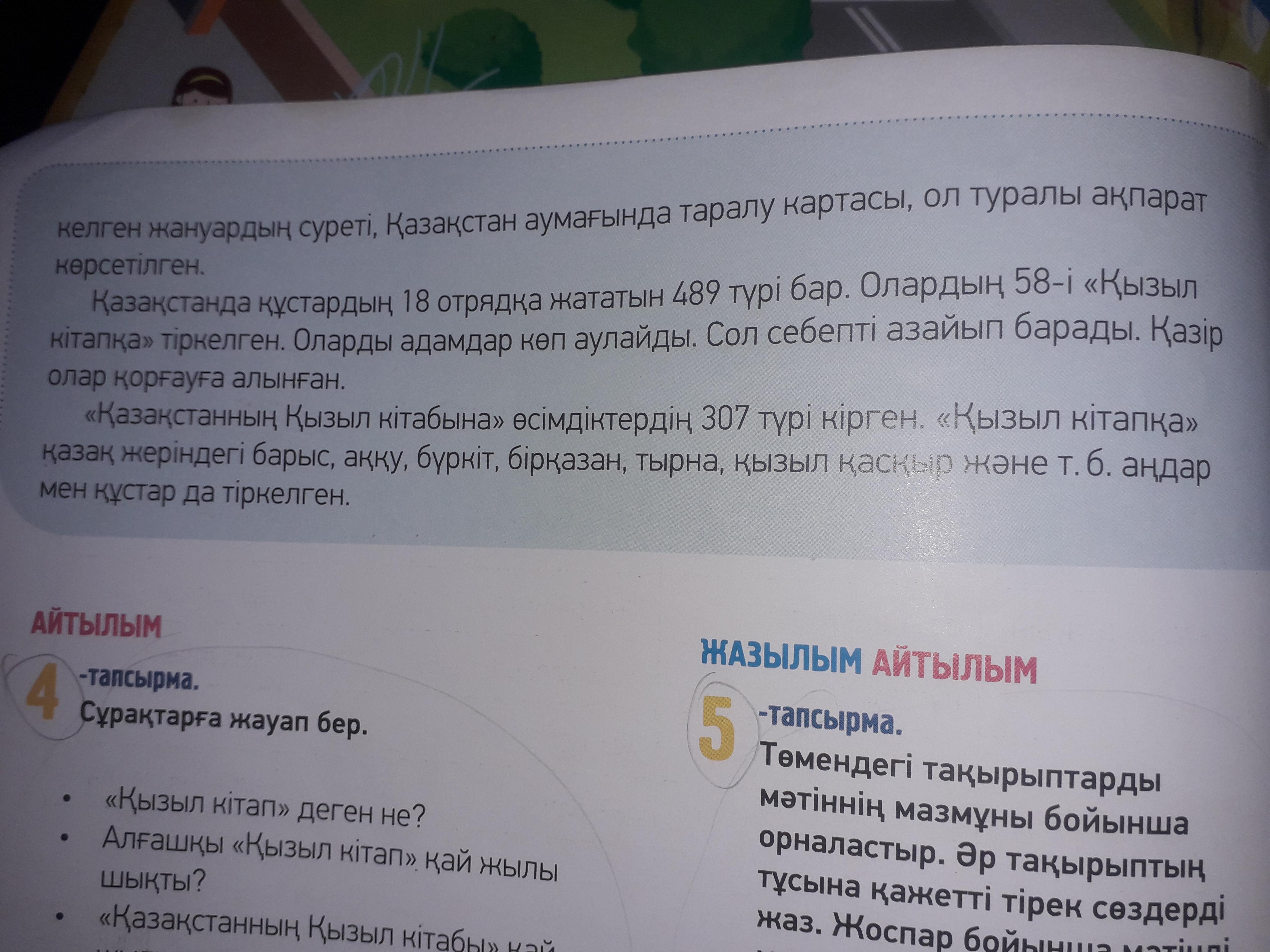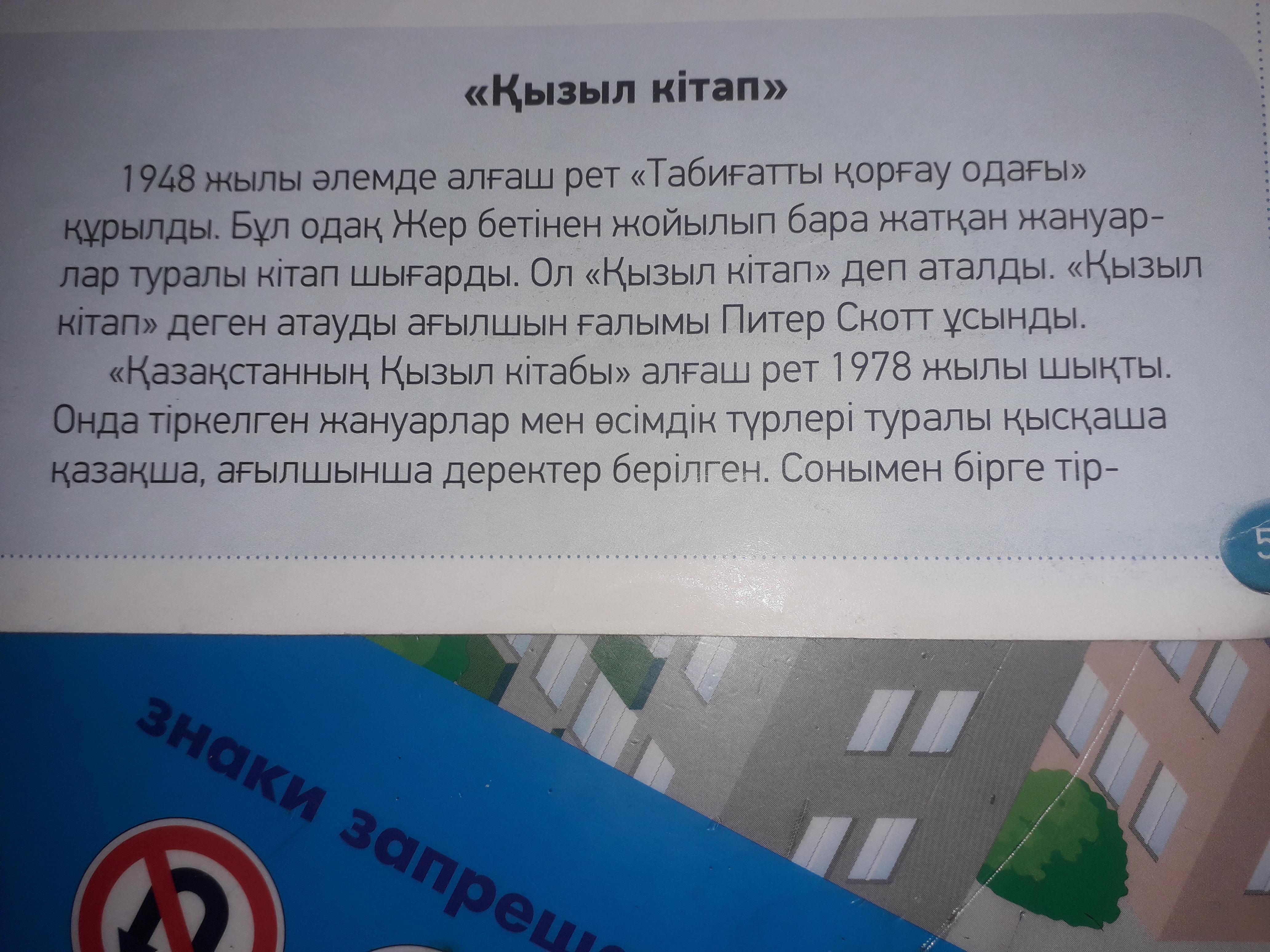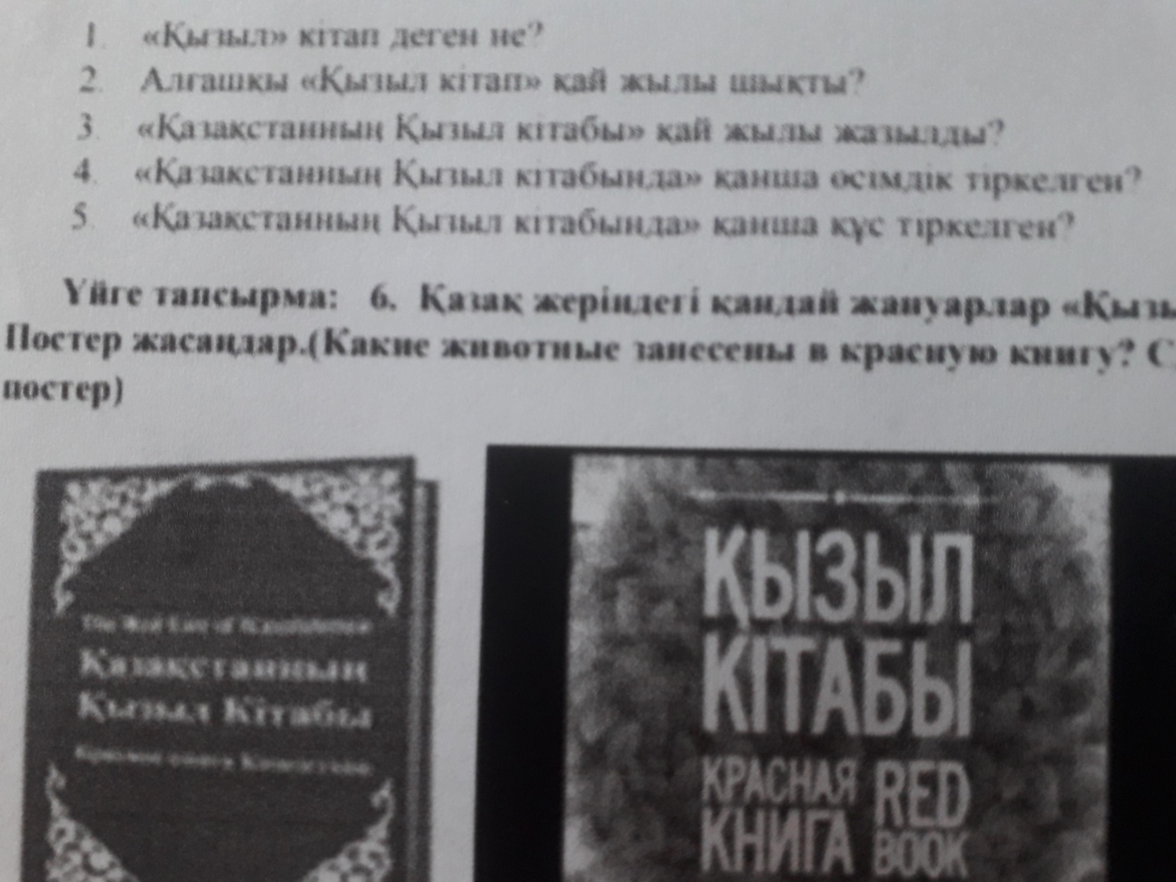 1. Қызыл кітап деген жойылып бара жатқан жануарларды сақтайтын кітап. Яғни ол кітапқа енген жануар қорғалуда.
