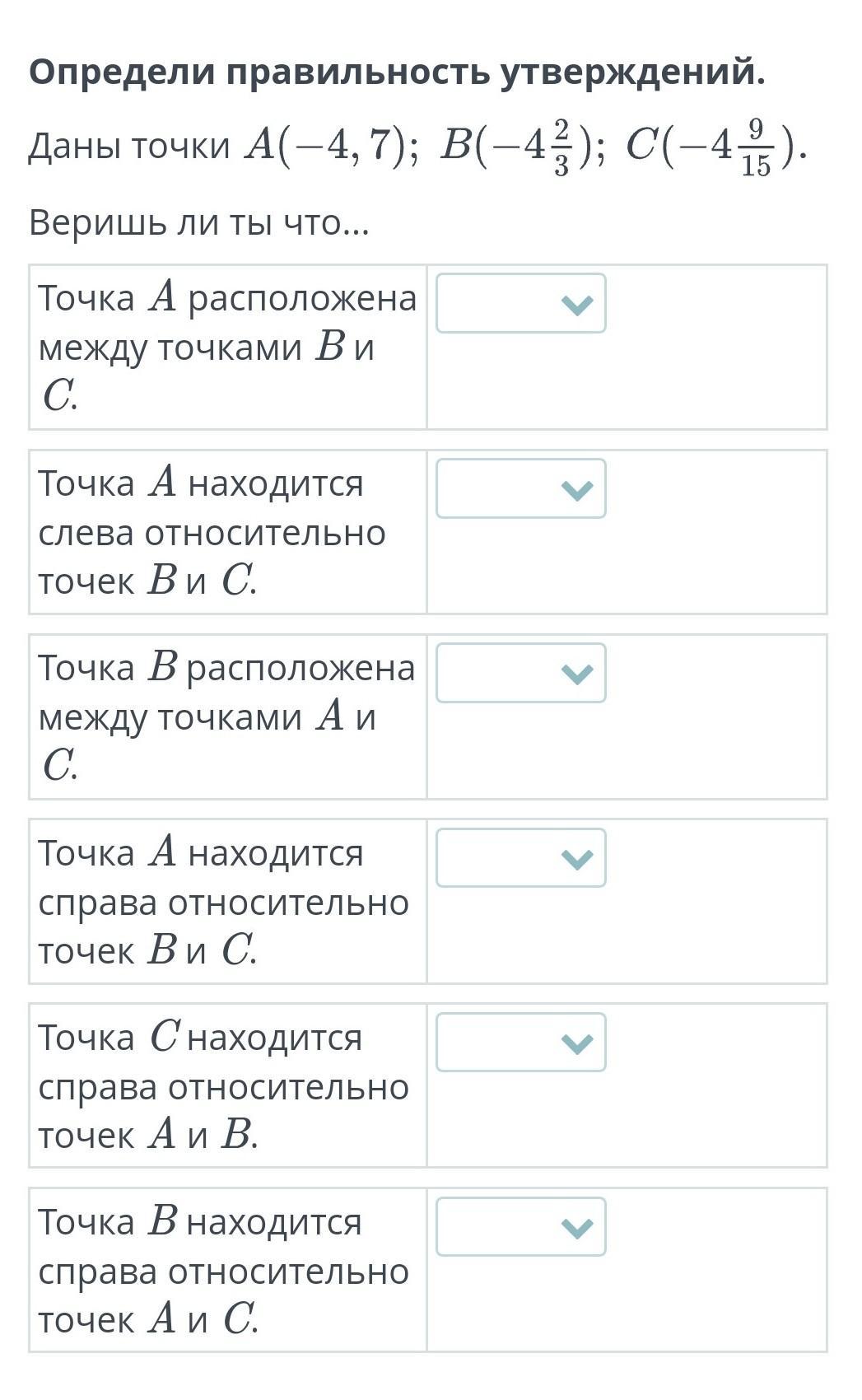 Определи правильное утверждение:даны точки А(-4, 7), В(-4 2/3), С(-4 9/15)
