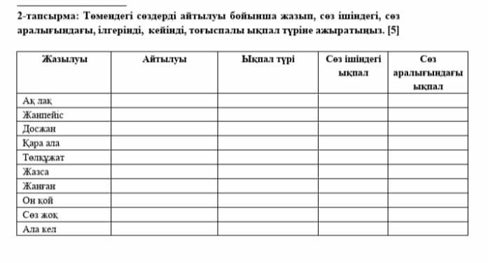 2 - тапсырма : Төмендегі сөздерді айтылуы бойынша жазып , сөз ішіндегі , сөз аралығындағы , ілгерінді , кейінді , тоғыспалы ықпал түріне ажыратыңыз . [ 5 ] Жазылуы Айтылуы ықпал түрі Се ішіндегі Сез ықпал аралығындағы ықпал Ак лак Жанпейіс Досжан Қара ала Телкұжат Жаса Жантан Он кой Сез жок Ала кел