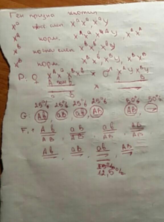 Ген цветовой слепоты и ген ночной слепоты, наследующиеся через Х-хромосому,находятся на расстоянии 50 морганид друг от друга.Оба признака рецессивны.