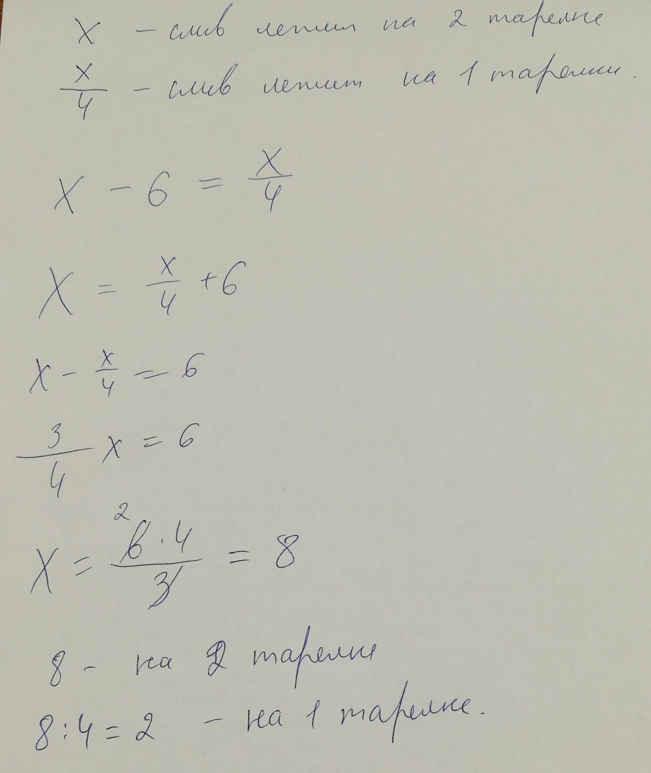 На первой тарелке лежит в 4 раз меньше слив, чем на второй. Если бы со второй тарелки переложила на первую 6 слив, то из на тарелка стало бы поровну. Сколько слив лежит на каждой тарелке