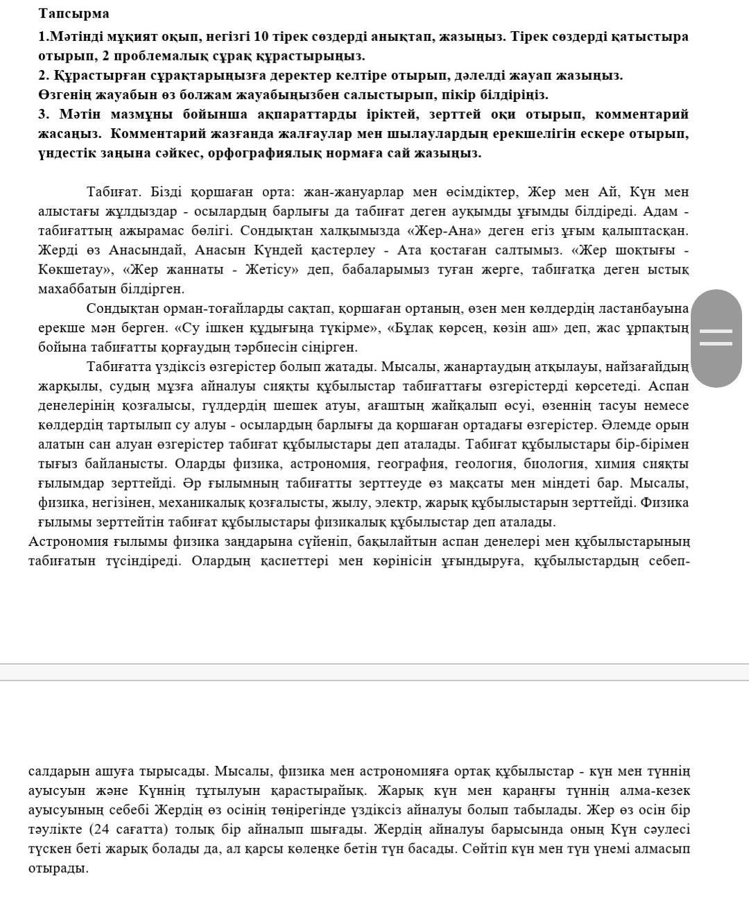1.Мәтінді мұқият оқып, негізгі 10 тірек сөздерді анықтап, жазыңыз. Тірек сөздерді қатыстыра отырып, 2 проблемалық сұрақ құрастырыңыз.