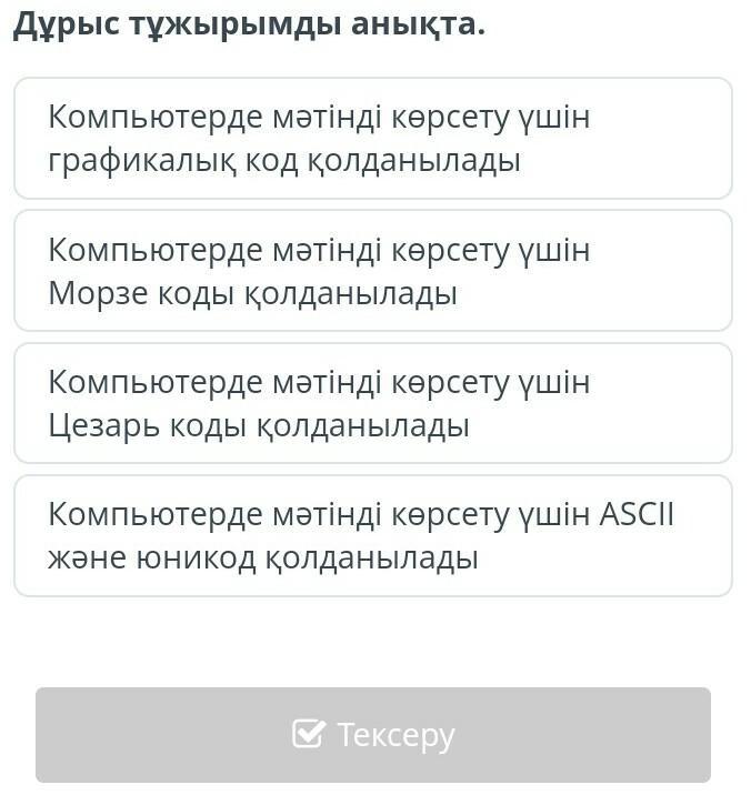 перевод Сделайте правильный выбор.Компьютер использует графический код для отображения текста . Компьютер использует азбуку мозре для отображения текста . Компьютер использует код Цезаря для отображения текста Асси и используется для отображения текста на компе