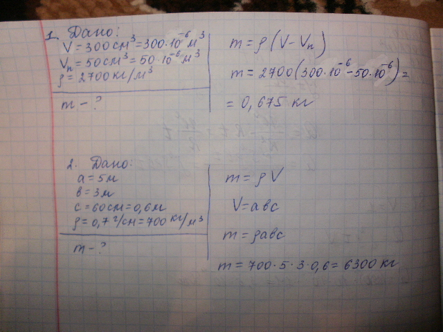 1.Яка маса алюмінієвої деталі об'ємом 300 см3, якщо вона має порожнину, об'єм якої 50 см3? Густина алюмінію 2700 кг/м3.