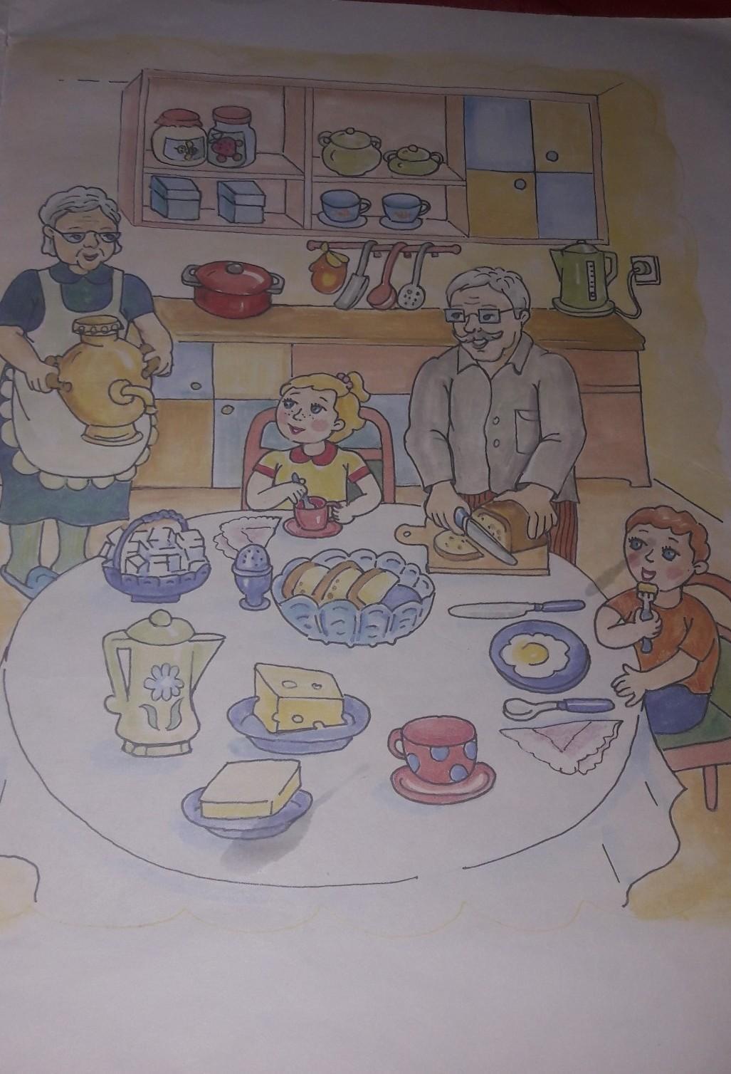 Дома есть девочка, брат, бабушка и дедушка .Бабушка заваривает чай. А дедушка режет хлеб.Мальчик ест яйшнецу .Девочка пьёт чай.Всем всё вкусно.
