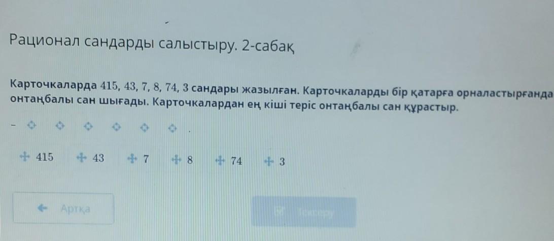 Осыдан, теріс сандарды салыстыру ережесі бойынша, –8 7 74 43 415 3 ең кіші теріс онтаңбалы сан болады