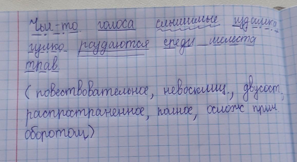 Разберите предложения и напишите характеристику: Чьи-то голоса слышимые издалека, гулко раздаются среди шелеста трав. 30 баллов