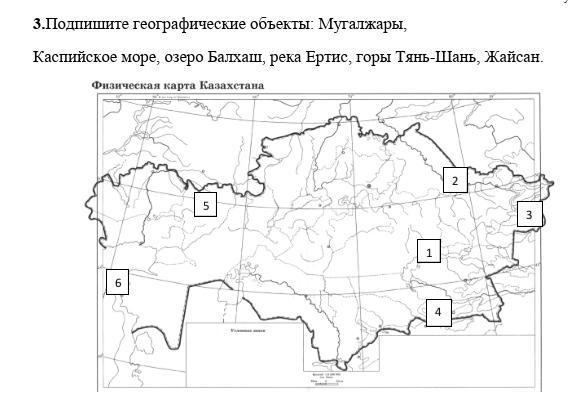 Подпишите географические объекты: Мугалжары, Каспийское море, озеро Балхаш, река Ертис, горы Тянь-Шань, Жайсан