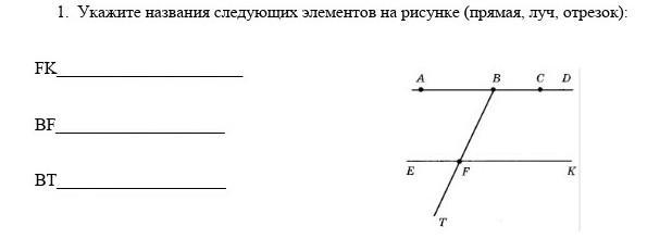 1.	Укажите названия следующих элементов на рисунке (прямая, луч, отрезок):