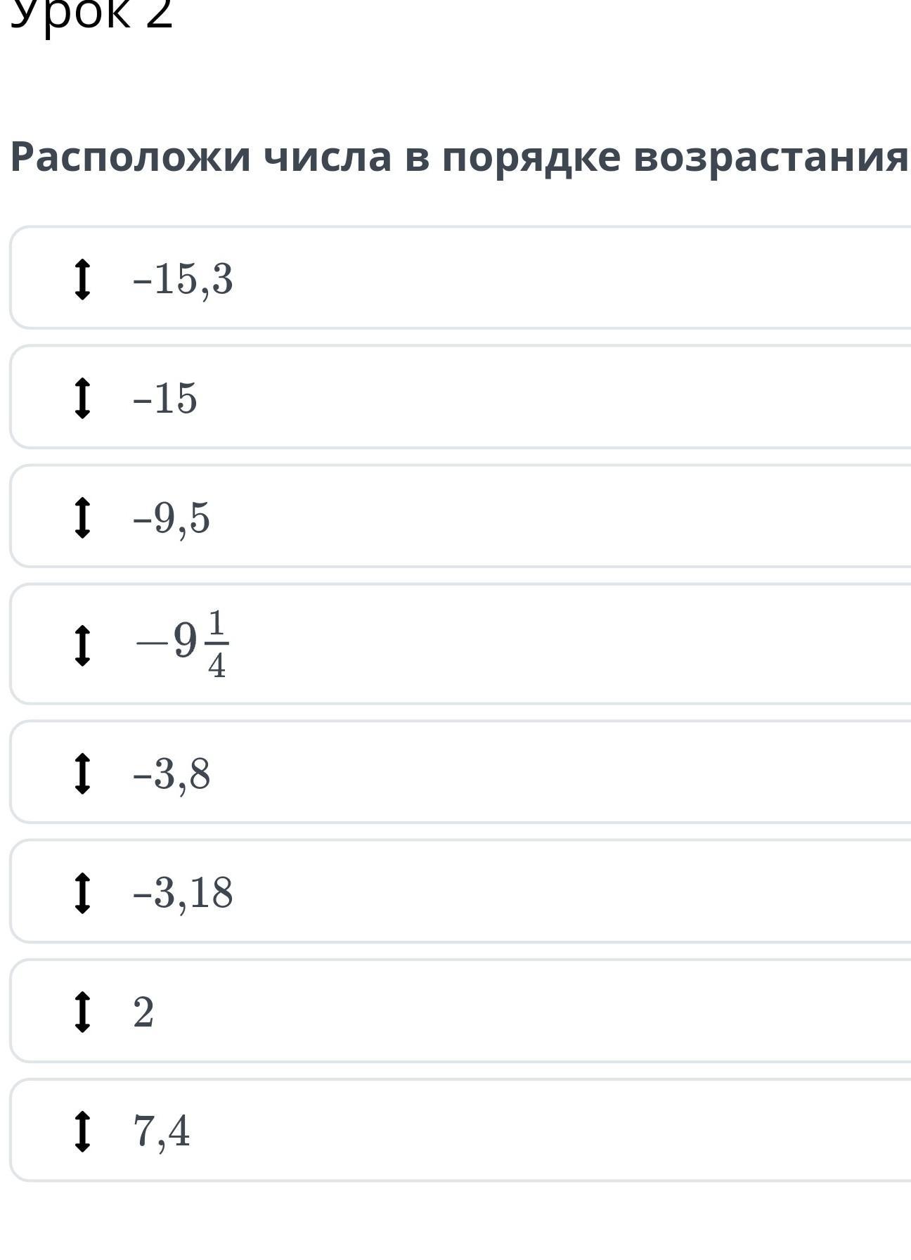 Расположи числа - 15, 3 I -15 - 9, 5 1 - 9 1/4 - 3, 8 I - 3, 18 I 2 1 7, 4 в порядке возрастания.