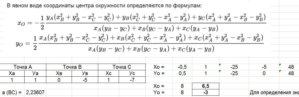 Находим координаты точек пересечения срединных перпендикуляров: приравниваем уравнения (1/2)х - 6,25 = -3