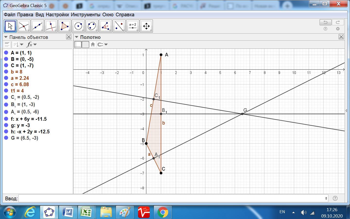 Даны вершины треугольника: A(1; 1), B(0; -5), C(1; -7).
