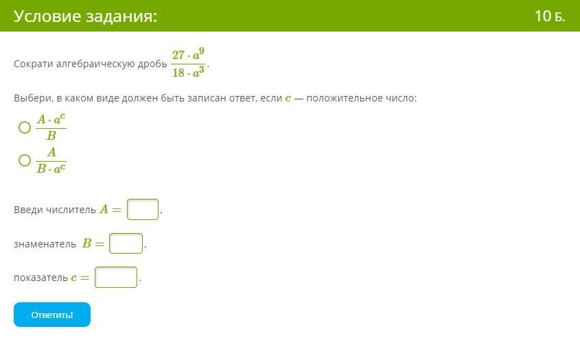 Сократи алгебраическую дробь 27⋅a9/18⋅a3.