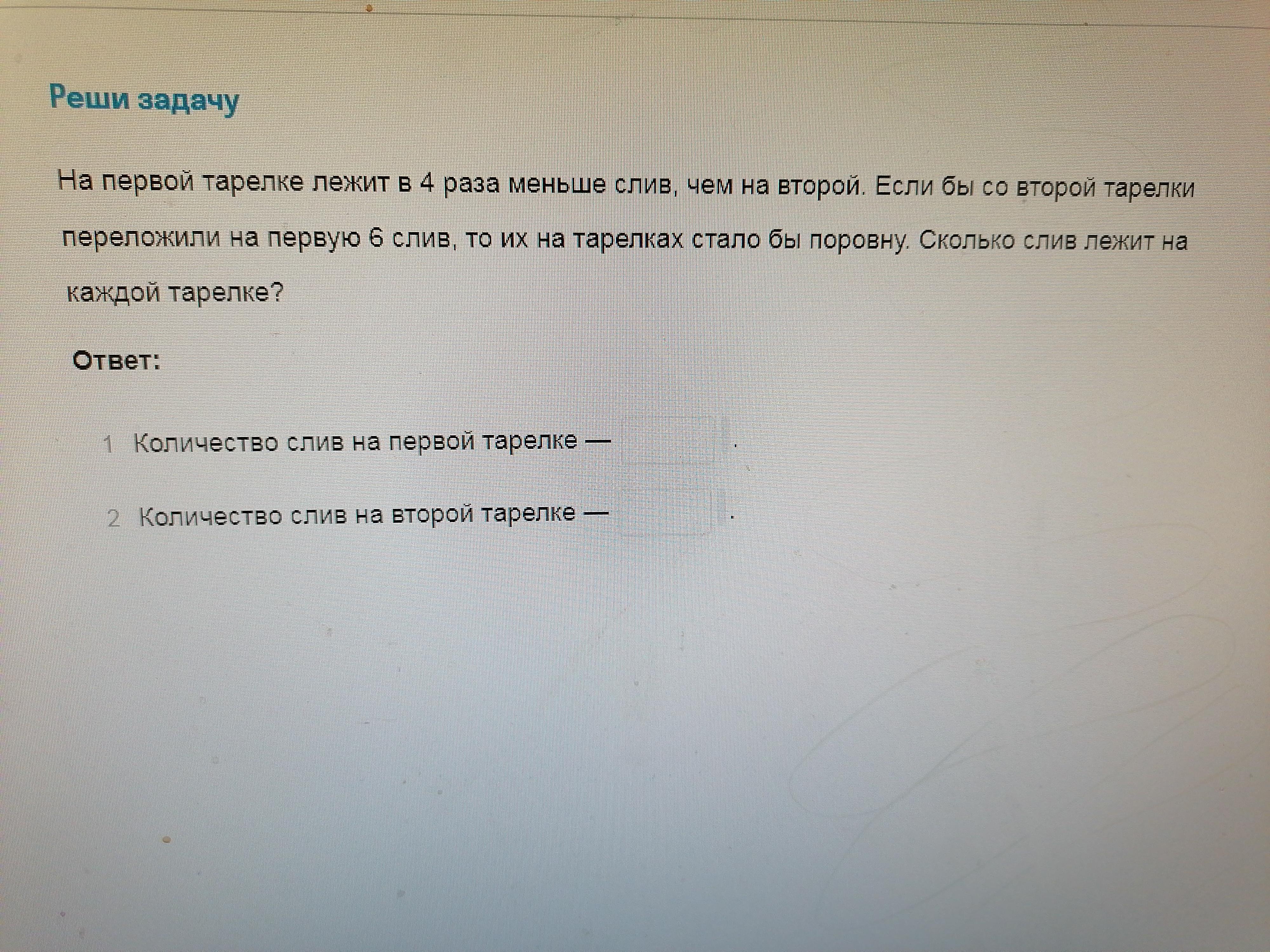 На первой тарелке лежит в 4 раза меньше слив, чем на второй. Если бы со второй тарелки переложили на первую 6 слив, то их на тарелках стало бы поровну. Сколько слив лежит на каждой тарелке?