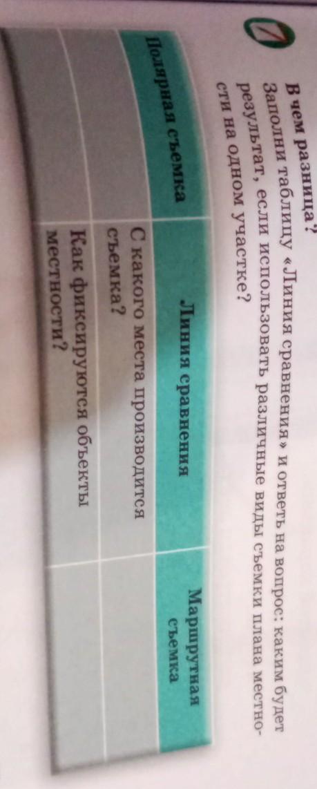 в чём разница заполните таблицу (Линия сравнения) и ответь на вопросы каким будет результат если использовать различные виды съемки плана местности на одном участке?